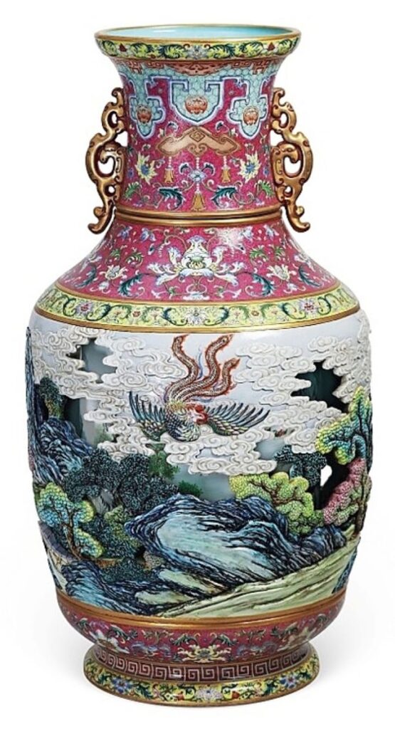 Mówimy o wazonie z porcelany famille rose, wysokości 40 cm, który powstał w cesarskich piecach Jingdezhen za panowania Qianlonga. Ścianki ażurowe, cztery medaliony z karpiami, szyja w kolorze żółtej pierwiosnki. Na dnie znak cesarski, autentyczny. Ekspert BBC obejrzał go wcześniej i stwierdził, że to „sprytna kopia”. No cóż.